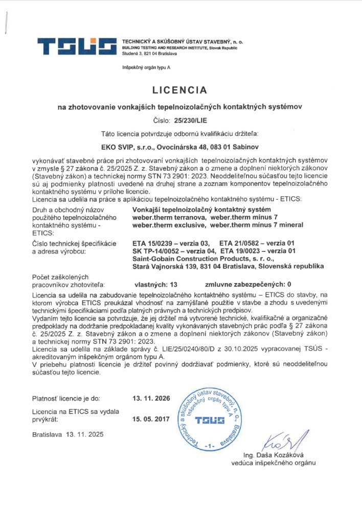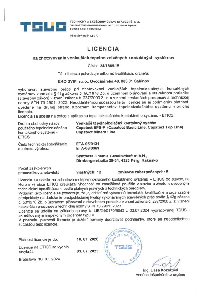 Sme držiteľom Licencie na zhotovovanie vonkajších tepelnoizolačných kontaktných systémov ETICS - WEBER, Licencie na zhotovovanie vonkajších tepelnoizolačných kontaktných systémov ETICS - CAPATEC