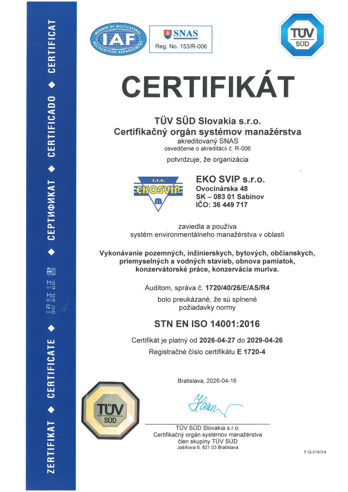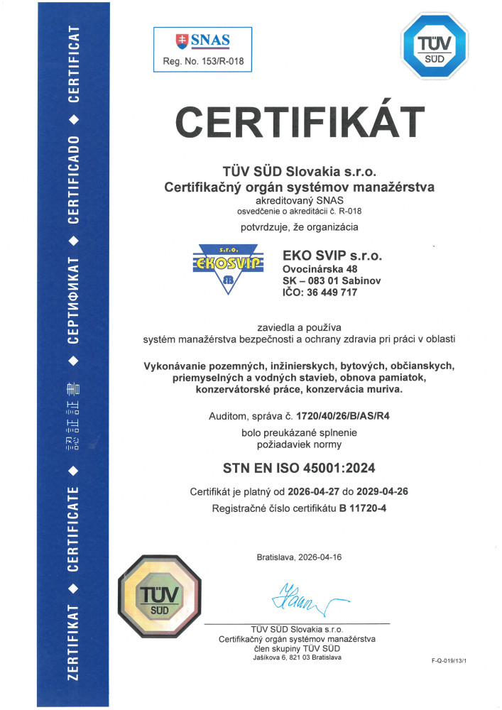 Dôkazom o kvalite našej práce sú aj certifikáty kvality podľa noriem STN EN ISO 9001:2016, STN EN ISO 14001:2016, STN ISO 45001:2024, ktorých sme držiteľom.